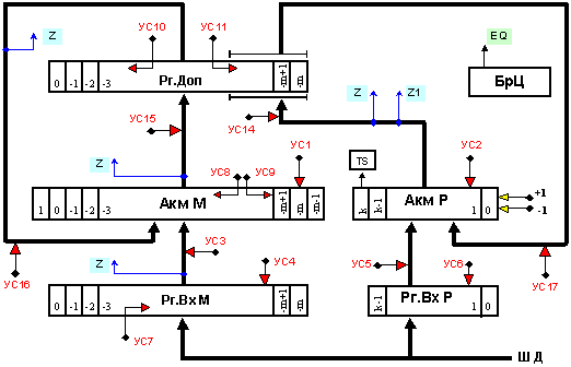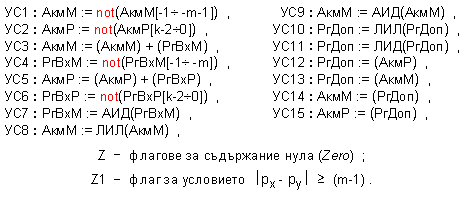 Като имаме предвид сложността на алгоритмите, в представената логическа структура е показана само онази част от връзките и управляващите сигнали, с помощта на която ще бъдат пояснени кратко алгоритмите за изпълнение на операциите с плаваща запетая.