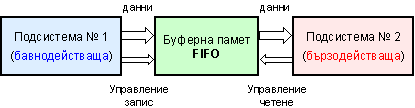 За буферната FIFO памет е характерно, че записът се извършва с бързодействието на подсистема №1, а четенето – с бързодействието на подсистема №2. Поради разликата в производителността буферната памет изпълнява ролята на еластична връзка между двете подсистеми (№1 и №2).