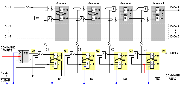 описаната логика, можем да си мислим, че ЗУ с организация FIFO има един вход и