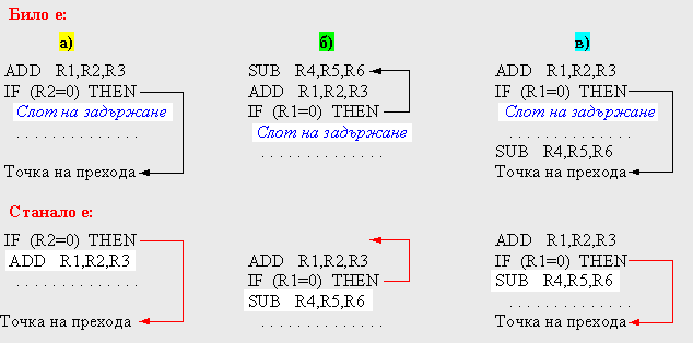 Можество статистически експерименти показват, че ефективността на планирането на преходите с един слот на задръжка (възможно най-елементарната схема) е висока – повече от 60% от слотовете се запълват успешно. При това повече от 80% от така запълнените слотове се оказват полезни за изпълнението на програмите. Това може да ни учуди, тъй като условните преходи се оказват изпълнени примерно на около 53% от случаите. Високият процент оползотворени слотове се обяснява с това, че почти половината от тях се оказват запълнени с команди, които предхождат командите за условен преход, т.е. по схема а), изпълнението на които е необходимо независимо от това изпълнява ли се преходът, или не.