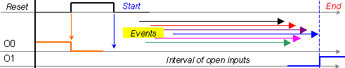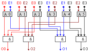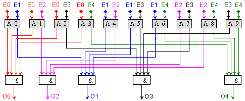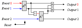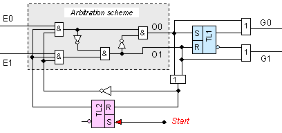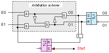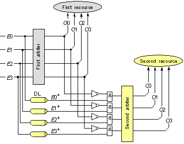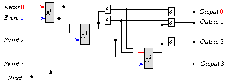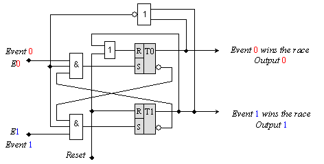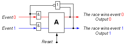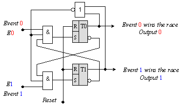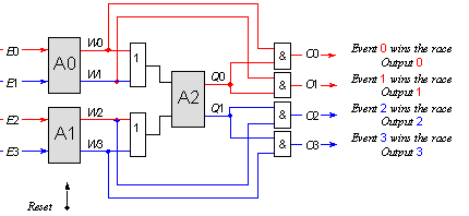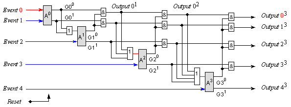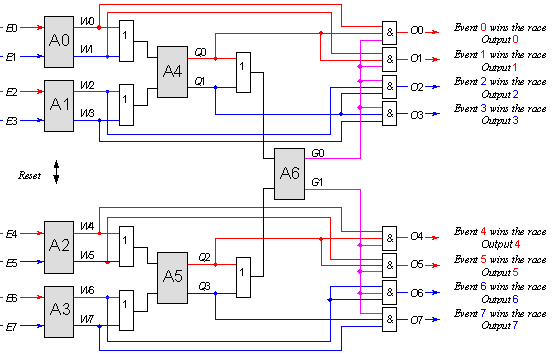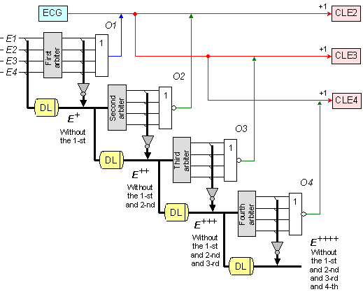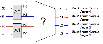 Така представеното на горната фигура решение обаче страда от един недостатък. Той се изразява в това, че броячите CLEi измерват латентностите на второто, третото, четвъртото и пр. събития, но в смисъла на съответната им подреденост при достигане на “финала”. Подредеността на финиширане обаче по никакъв начин не идентифицира събитието като принадлежащо на съответния източник, който го е генерирал. Това ясно може да се забележи от рисунката на фигура 5.5.2.2.22. На нея се вижда следната подредба: LE3 < EL2 < LE5 < LE1 < LE6. С други думи, например, събитие E1 финишира 5-то по ред и неговото закъснение ще бъде измерено от брояч CLE4. Идентификацията, че стойността в брояч CLE4 се отнася за събитие E1, а не за някое друго, изисква към изхода на съответния арбитър (в случая A5) да бъде подключен шифратор.