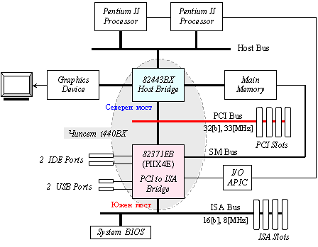 Фиг. 5.5.3.1.1. Системна архитектура с чипсет i440ВХ