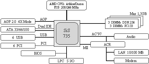 Връзката между двата моста представлява основният проблем и недостатък на шинно-мостовата архитектура. Минимизирайки разстоянията между двата моста, производителят SiS стигна до там, че ги затвори в една интегрална схема. Скоростта на вътрешната връзка в такава схема е наречена MuTiOL и тя достига скорост на трансфер до 1[GiB/s]. Структурата на компютърна система на базата на чипсета SiS 735 е показана на фигура 5.5.3.3.2.