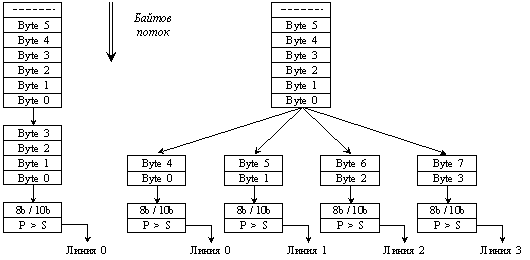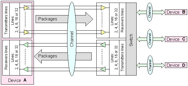 Архитектура PCI Express отговаря на всички изисквания, предявени към третото поколение входно-изходни системи. Нейните разширени функции и мащабируема производителност ѝ позволяват да стане унифицирано решение за множество платформи – настолни, мобилни, сървърни, устройства за връзка и вграждащи се устройства. Едно от концептуалните отличия на интерфейса PCI Express, което позволява същественото увеличение на производителността на системата това възможността при свързване на крайни устройства да се приложи топология “звезда” (вижте фигурите 5.5.3.1.7 и 8). Каналът (Link), свързващ крайно устройство с комутатора (switch), представлява съвкупност последователни еднобитови дуплексни линии, наричани линии (Lanes). Пропускателната възможност на линиите може да бъде линейно мащабирана (x2 link), (x4 link), … , (32 link). Слотът обаче може да бъде по-широк от подведения към него канал, т.е. на слот х16 фактически може да бъде въведен канал х8 и пр. По този начин една карта, чиято линия е х4, следва да работи нормално в слот с ширина на линията х8 и повече. Съгласуващата канала PCI Express процедура осигурява максимално възможната ширина на линията за работа. При предаване на данни по канали с много линии се прилага последователно разсейване на данните (вижте фигура 5.5.3.1.14).