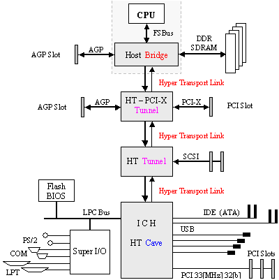 Високо скоростната шина Hyper Transport е предназначена да бъде използвана в компютърните системи преди всичко в качеството й на вътрешна локална шина. В сравнение с PCI шината, интерфейсът НТ позволява да се намали броят на проводниците върху системната платка, да се игнорира влиянието на закъсненията на сигналите, да се намали консумацията на ток и в цяло да се повиши пропускателната способност. Основната идея на НТ интерфейса е, както вече отбелязахме, да въведе нов тип съединение. Структурната схема на компютърна система с хипертранспортна архитектура на входно-изходната система е представена на следващата фигура.