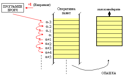 ред адрес, т.е. според програмния брояч. След като в конвейера постъпи