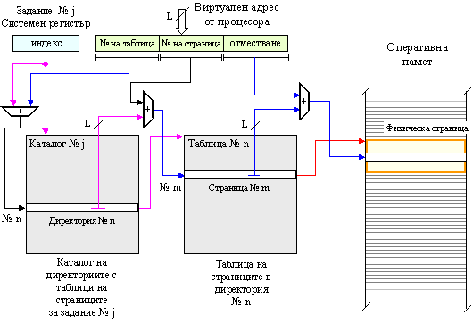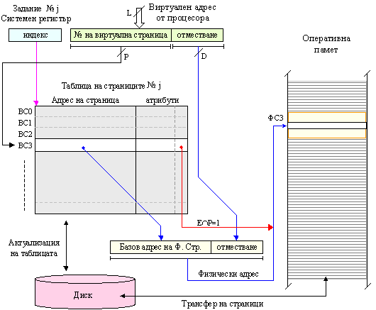 представлява номера на страницата във виртуалното адресно пространство, а D – отместване в рамките на