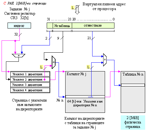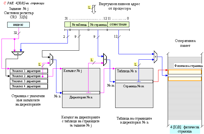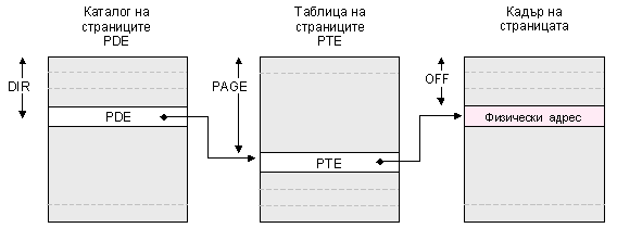 преобразуване. Управляващият регистър CR3 съдържа физическия адрес на каталога на страниците (page directory)