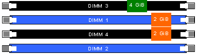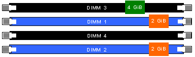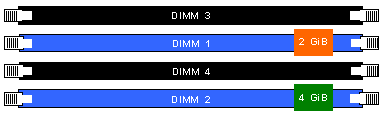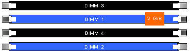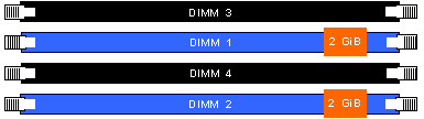 · 2[GiB] в слот 1, заедно с долните 2[GiB] в слот 2, работят в двуканален режим ;