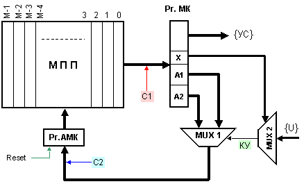 За функциониране на управляващия автомат според структурата на неговата микрокоманда може да се приложи следната примерна логическа структура: