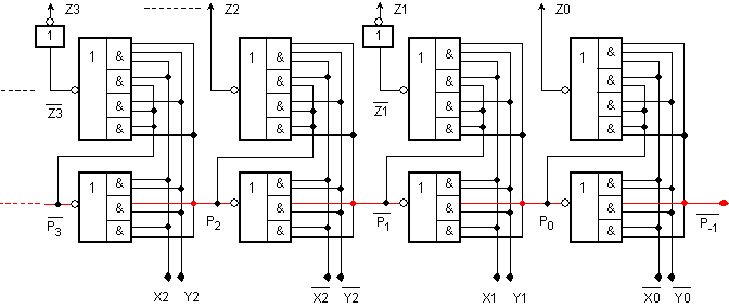Същата идея (за ускорен последователен пренос) е реализирана и в други интегрални схеми - например в схемата 7482, представляваща двуразряден двоичен суматор. В тази схема входът за пренос от по-младшия разряд е инверсен. Казаното се отнася и за ИС на 4-разрядния суматор 7483.