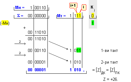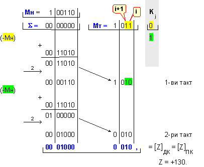 умножение Z=X.Y на числата X=-26 и Y=-5.