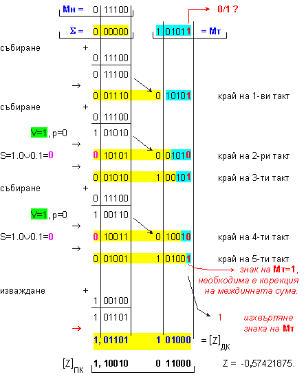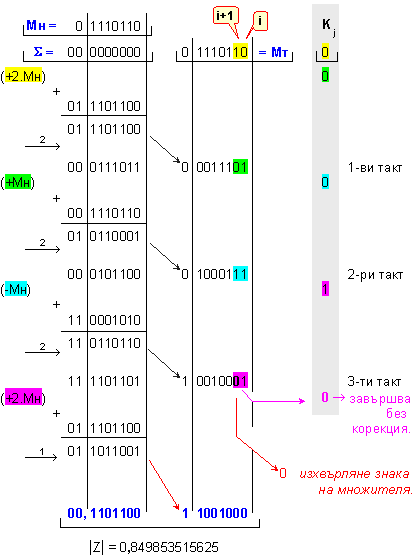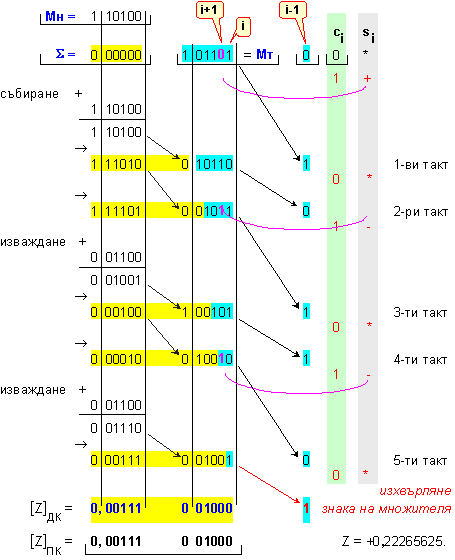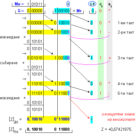 умножение Z=X.Y на числата X=-0,65625 и Y=-0,875 , които