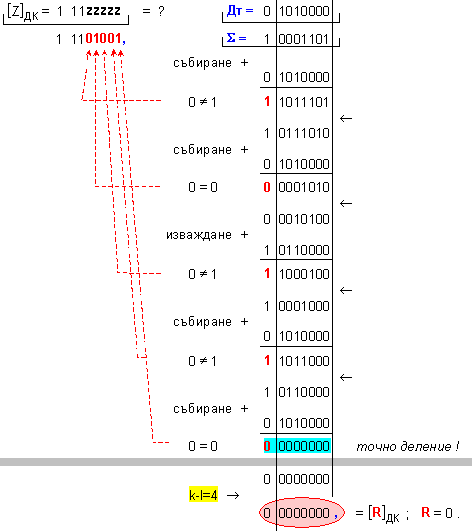 При деление на числа в допълнителен код на всеки такт трябва да се определя поредната цифра, която се записва в частното, както и да се определя следващата операция. Освен това в края на делението трябва да се извършва проверка за необходимост от корекция на частното. Ако такава е необходима, то в края на делението, към частното се прибавя единица. Тъй като числата със знак, остатъкът носи знака на делимото, но само ако частното е отрицателно (т.е. операндите са с различни знаци). Остатъкът се получава в допълнителен код.