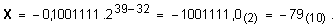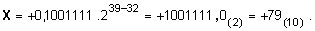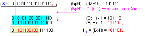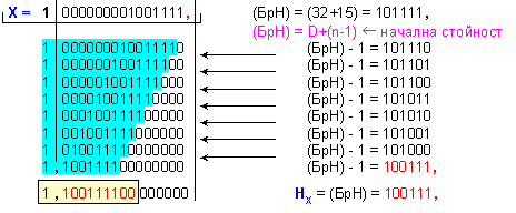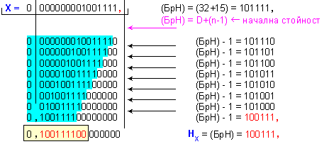 където с L е означен броят на изместванията на числото в разрядната мрежа при неговата лява нормализация. Числото L е число със знак, тъй като изместванията са възможни в посока както наляво, така и надясно. Случаят с изместване надясно се отнася единствено за най-малкото число, представимо в допълнителен код в разрядната мрежа с фиксирана запетая, т.е. за Xmin . Изчислението на порядъка се изпълнява апаратно в брояча на характеристиките. Началната стойност в този брояч се установява автоматично БрН:=(n-1). Тъй като се работи в стандарта с изместен порядък, т.е. с характеристиката, началната стойност следва да бъде БрН:=D+(n-1). Тогава характеристиката се изчислява така