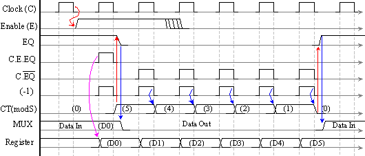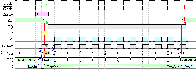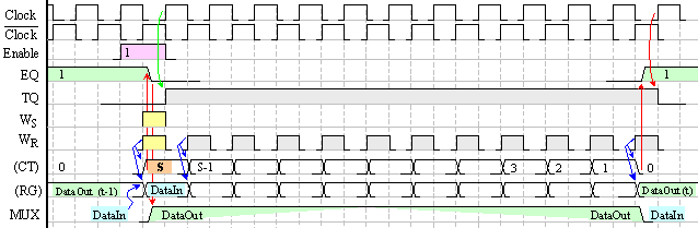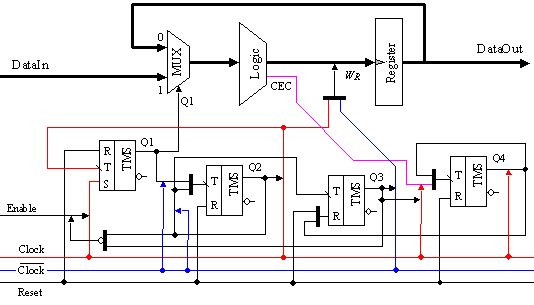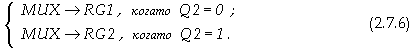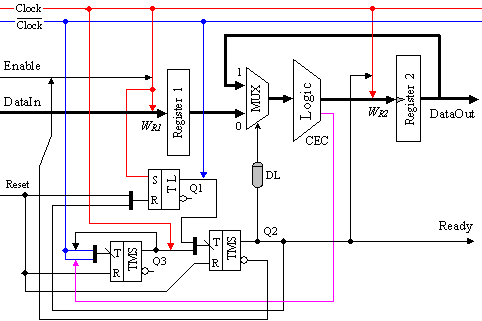 Тригер Т1 управлява входния даннов милтиплексор MUX, а тригер Т2 управлява