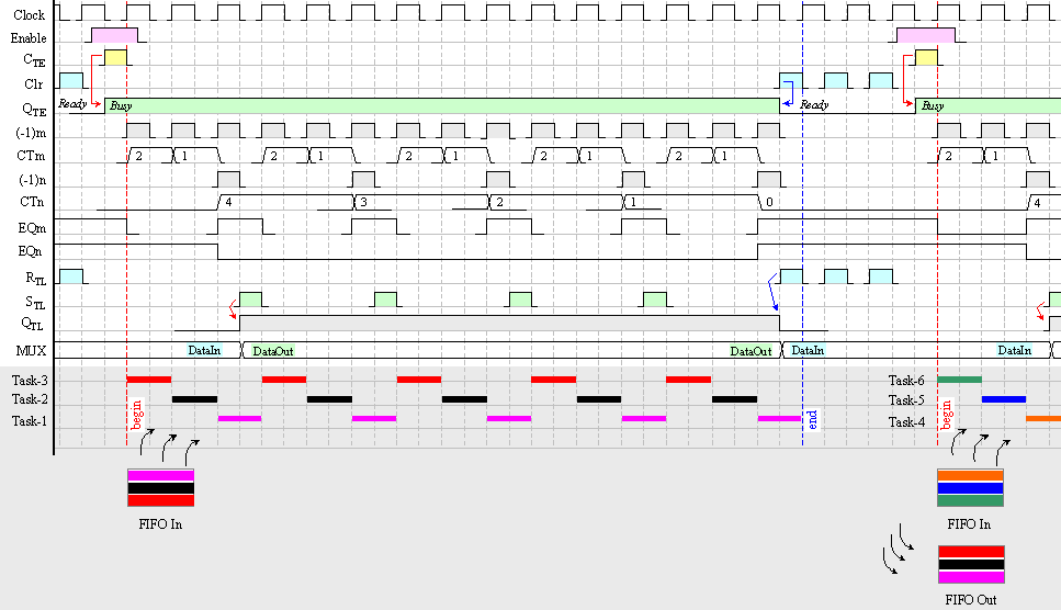 цикъла. Сигналите FIFO-Out_Full и FIFO-Out_Empty не са изобразени. За тях са предположени стойности, които не